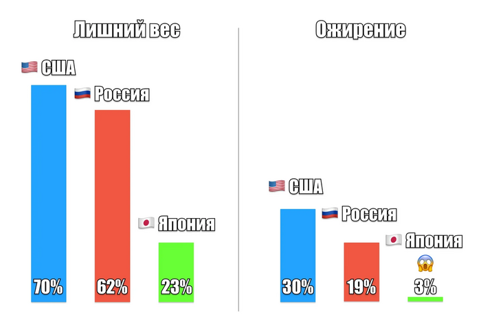 Итого: у нас в стране лишний вес на себе таскает 62% населения!!! А диагноз ожирение 19%. А в Японии ожирение всего у 3%, причем я так понимаю, если из статистики убрать сумоистов, то там вообще ноль.