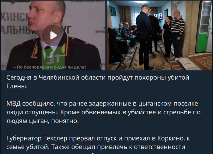 Хрустальный шар подсказывает, что через какое-то время отрапортуют о том, что "по итогам расследования событий в Коркино привлечено к уголовной ответственности Х (какая-то впечатляющая цифра) человек". Справедливость восторжествовала. Правда, что за люди, почему-то опять не напишут. А окажется, что из них цыган будет двое: 1) онжеребёнок, который зарезал женщину (из-за возраста, положительных характеристик и прочих смягчающих получит лет 5, выйдет года через три) и 2)тот, который стрелял по людям (отделается условкой). А все остальные- местные жители, и их будет несколько десятков.