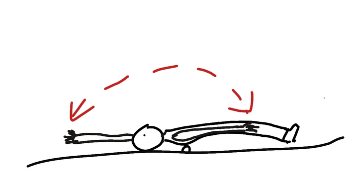 Взять полотенце или что-то подобное и свернуть в валик. Положить валик на пол и лечь на него сутулой частью спины. Руки параллельно телу и направлены в противоположные стороны (одна вверх, другая вниз относительно головы). В таком положении нужно делать махи руками одновременно. Схема на рисунке:
