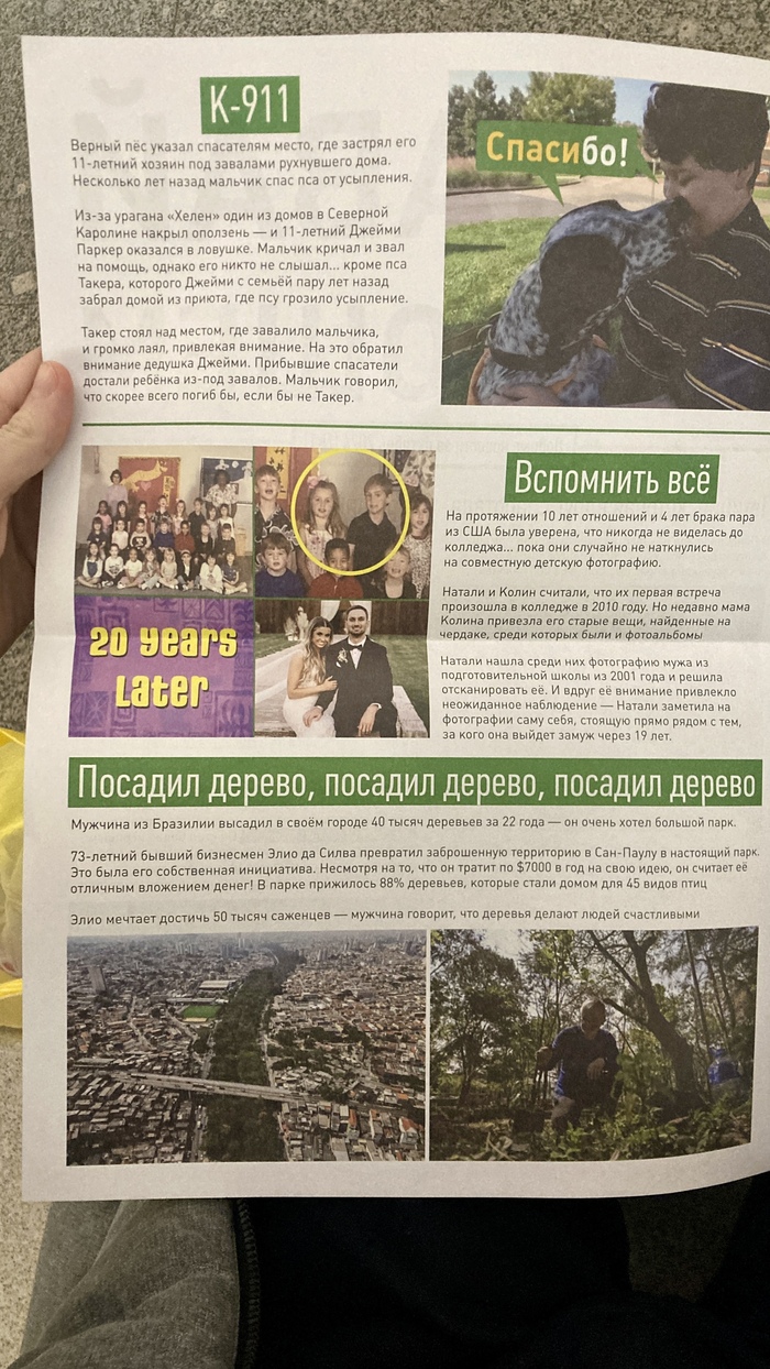 И в какой-то момент, проходя в метро мимо раздачи газет, в голову пришла мысль: «Вот люди читают про всё происходящее в мире (как правило плохое). А что если мы напечатаем свою газету — соберём добрые новости за минувший месяц, напечатаем и раздадим?