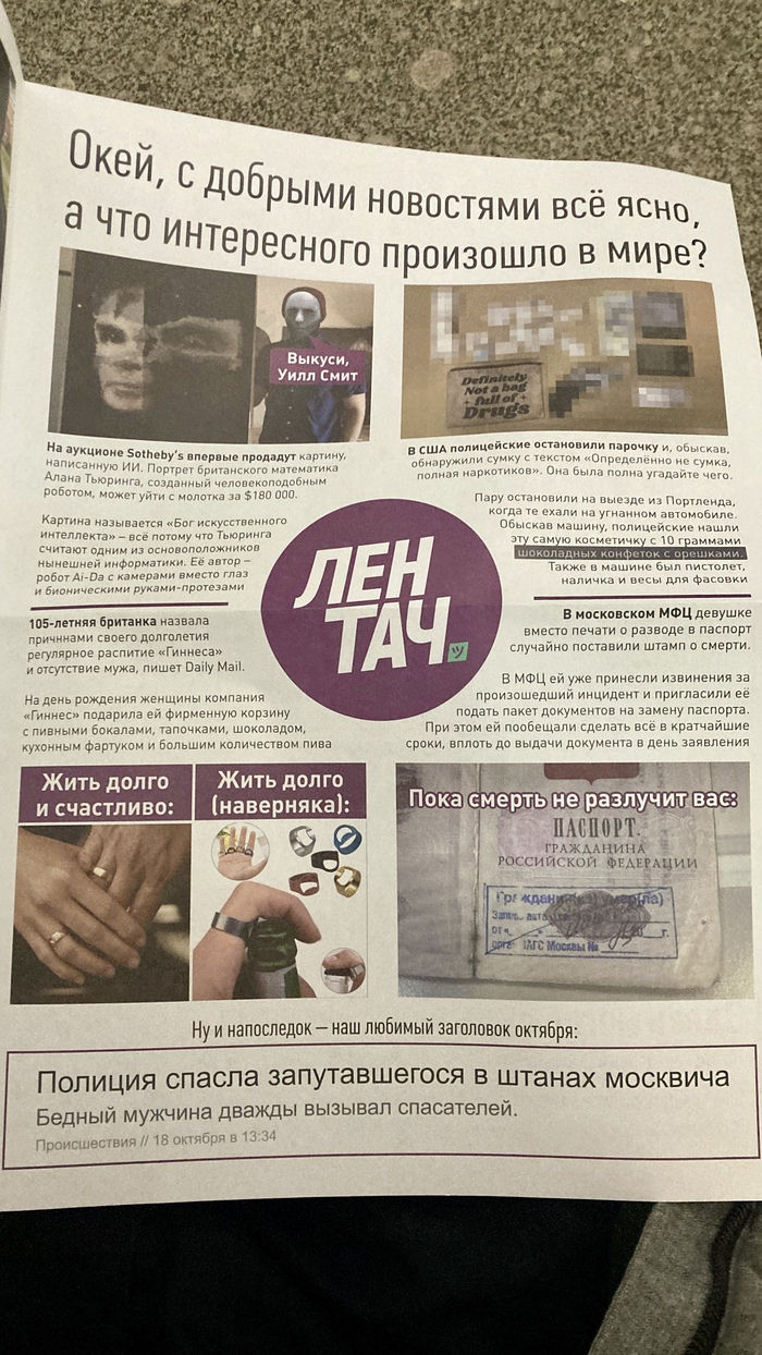В итоге мы всё сверстали, отпечатали небольшой тираж — и сегодня утром раздавали её на станции метро Бульвар Рокоссовского. Сегодня вечером и завтра утром мы съездим на другие станции и дораздадим оставшуюся часть, поэтому если вдруг будете проходить мимо — не проходите мимо! :)