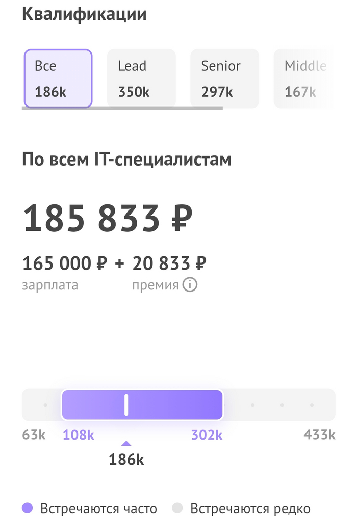 Тут четко обозначено, что зарплаты в IT более 300 - "встречаются редко". Поэтому все эти прекрасные истории про айтишников с зарплатами от 700к пишущих на "Питончике" - это инфоцыганство и демагогия на уровне разговоров в детском саду. Статистика явно говорит, что таких заоблачных зарплат в IT для простых исполнителей просто НЕТ. Нет по той простой причине, что это не какие-то сверхуникальные знания или способности и среднестатистический айтишник просто не стоит таких фантастических денег.