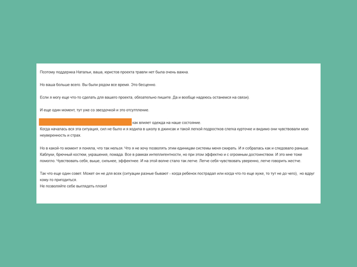 Здесь я отвлекусь и хочу сказать, что огромную юридическую поддержку я получила от проекта травлинет.рф [Прим. Ч.: я, кстати, ознакомился с памятками, подготовленными их юристом, впечатляет, позже узнаю, можно ли их опубликовать (с ссылкой на них, разумеется). В любой момент могу отправить эти памятки по запросу, если на почту напишите], а огромную моральную и эмоциональную поддержку, а также помощь с ответом на вопрос «что делать» от @ChelovkzKemerova.