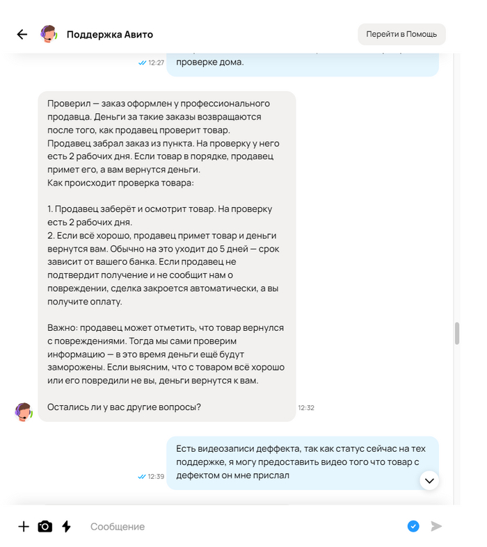 И еще хочется добавить мои попытки написать в поддержку, точнее ответы от Авито на мои пруфы что продавец развел и их и меня и тем самым вы меня "ограбили".