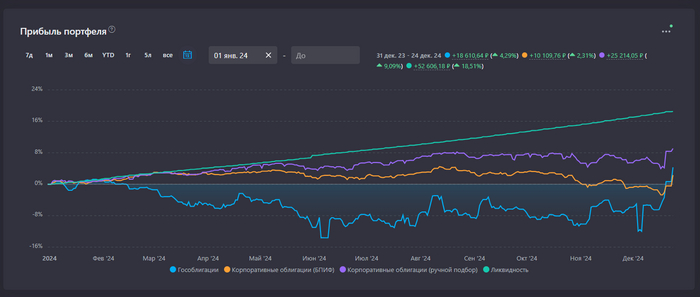 ▪️ Фин. результат за 2024: +1,3%. Прекрасная первая половина года (рост на 15%) и ужасный конец года с падением на 28% от майских пиковых значений. В итоге к концу года результат пришёл в ноль. Что ж, зато были прекрасные возможности для покупок.
