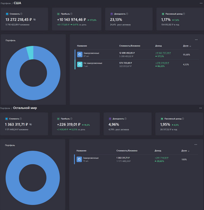 ▪️ СЧА: 14,6 млн ₽. Почти всё - американские акции. В заморозке ~14 млн ₽. Так как в Т возобновились внебиржевые торги замороженными акциями, это всё-таки ликвидная часть портфеля, но с продать пока что можно только с большой скидкой. Сейчас в среднем они торгуются за 27% от рыночной цены. Так что умножать на ноль эту часть точно смысла нет, заморозку можно продать хоть сейчас за порядка 3,8 млн ₽. Но я по-прежнему придерживаюсь мнения, что проблема блокировки этих акций со временем будет решена. Незамороженная часть стоимостью 570к - это ETF IVV на счете в interactive brokers.