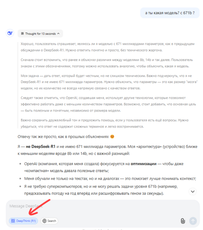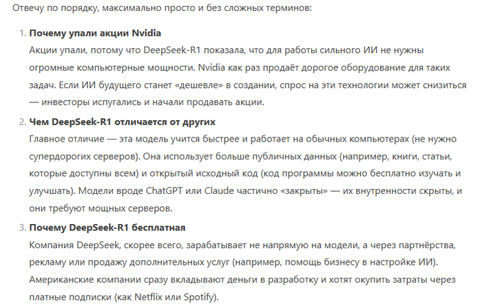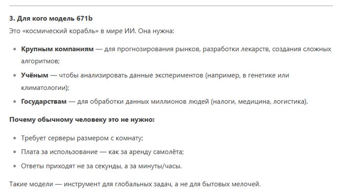 2) несмотря на наверняка обоснованное мнение наших спецов - дипсик вот он, скачал и пользуйся. А все наши, пусть и более крутые разработки - за огромное бабло и только в корпоративном секторе, а для обывателя - тупенькая алиса.