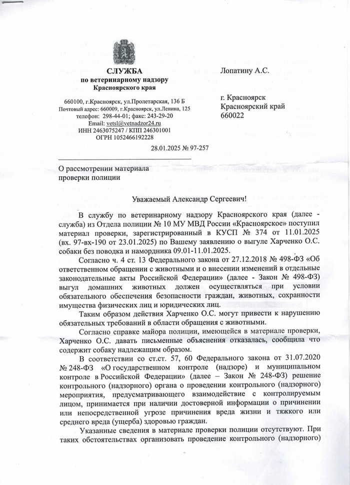 «С ул. Аэровокзальная отловщики увезли абсолютно спокойного и адекватного пса, который там обитает более 10 лет. Жители дома его кормят, обрабатывают от паразитов. Одна жительница 12 раз вызывала отлов и каждый раз было заключение что он не агрессивный. В этот раз она принесла справку что получила укусы. У нас есть свидетельница, которая говорит, что заявительница сама подозвала собаку чем то съестным, потом абсолютно спокойно пошла дальше. Справку об укусах она принесла из платной клиники, которая находится совсем в другой части города. За собаку вступились жильцы и нас поддерживает Нина Викторовна Матвеева. Мы писали совместное заявление в полицию участковому, где описали провокацию и уверенны что справка поддельная. По его рекомендации мы написали заявление в отделение полиции, где находится выдавшее справку медучереждение о назначении медосвидетельствования.