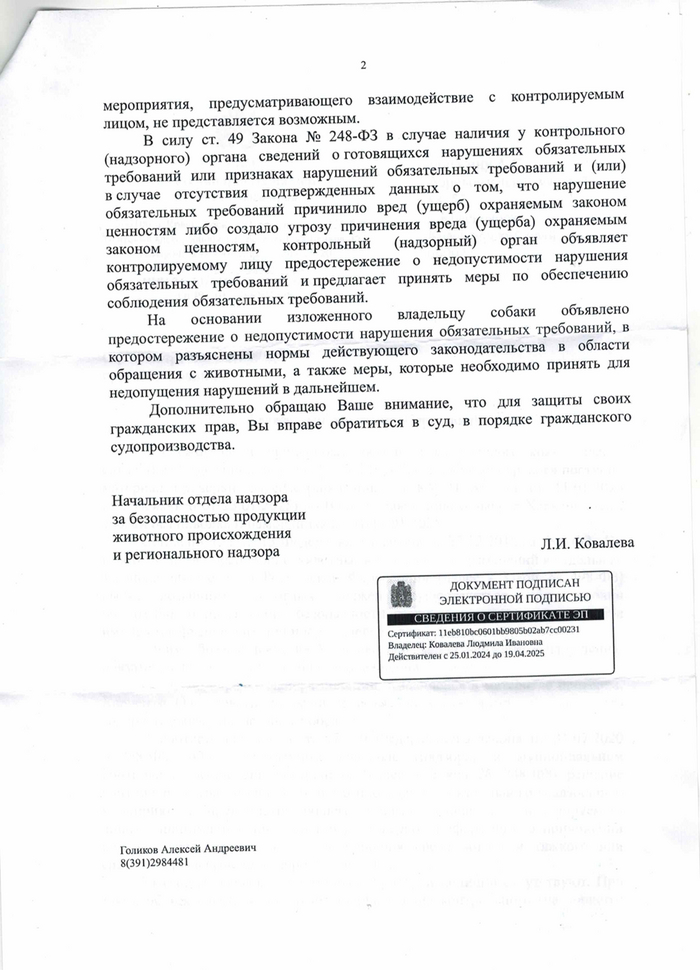 Обращение к участковому подействовало неоднозначно, так как на первый раз, в итоге, обошлись разъяснительной беседой о нормах содержания (правда тут еще момент – новый хозяин Джэка в лице бабы Оли при беседе уверила участкового, что пес всегда под присмотром, то есть присутствует легкое введение в заблуждение органов власти). Собакен, что покусал жену, опять гуляет. От ветнадзора также на первый раз проведена профилактическая беседа. Вроде бы и послали куда подальше, но сам факт проблемы поднят.