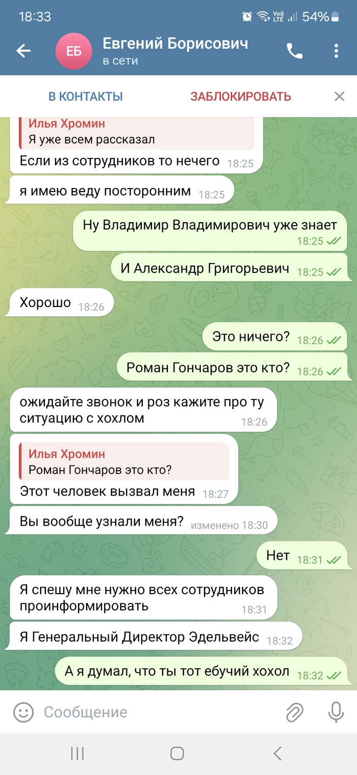Пишет мне в ТГ акк с именем и фамилией нашего дира. Мол, "добрый день! я по делу"