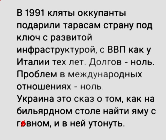 1. “В 1991 кляты оккупанты подарили тарасам страну под ключ с развитой инфраструктурой”