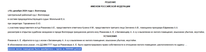 Продали ее за 2,8 млн, а не за 2,5 как заявляют журналисты, это следует из решения по иску нового собственника о выселении должника, размещенного на сайте Центрального районного суда Волгограда.