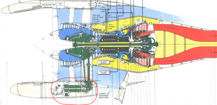 Это так называемая коробка приводов(Accessory Gearbox, AGB). Проще говоря, это трансмиссия и привод для всяческих агрегатов, необходимых для работы двигателя и других систем самолета. На ней устанавливаются топливные и гидронасосы, генераторы и так далее. Чтобы привести ее в движение используется угловая передача. На конец вала N2 насажена шестерня, которая вращает промежуточный вал.