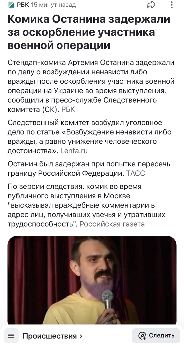 Мне кажется всё дело в том, насколько нам близка тема над который шутят, весь рунет полон шуток про 9.11, холокост, шутинги в американских школах и прочего, но шуток про блокаду Ленинграда, Крокус, Беслан я не видел и это нормально, нельзя шутить про холокост в присутствии евреев, про 9.11 при американцах, но в своей компании, когда это никого не может задеть такое позволительно, если масштабировать, то тема СВО задевает всех Российских граждан, поэтому за подобные высказывания, особенно со сцены, а не на кухне, правильно сажать