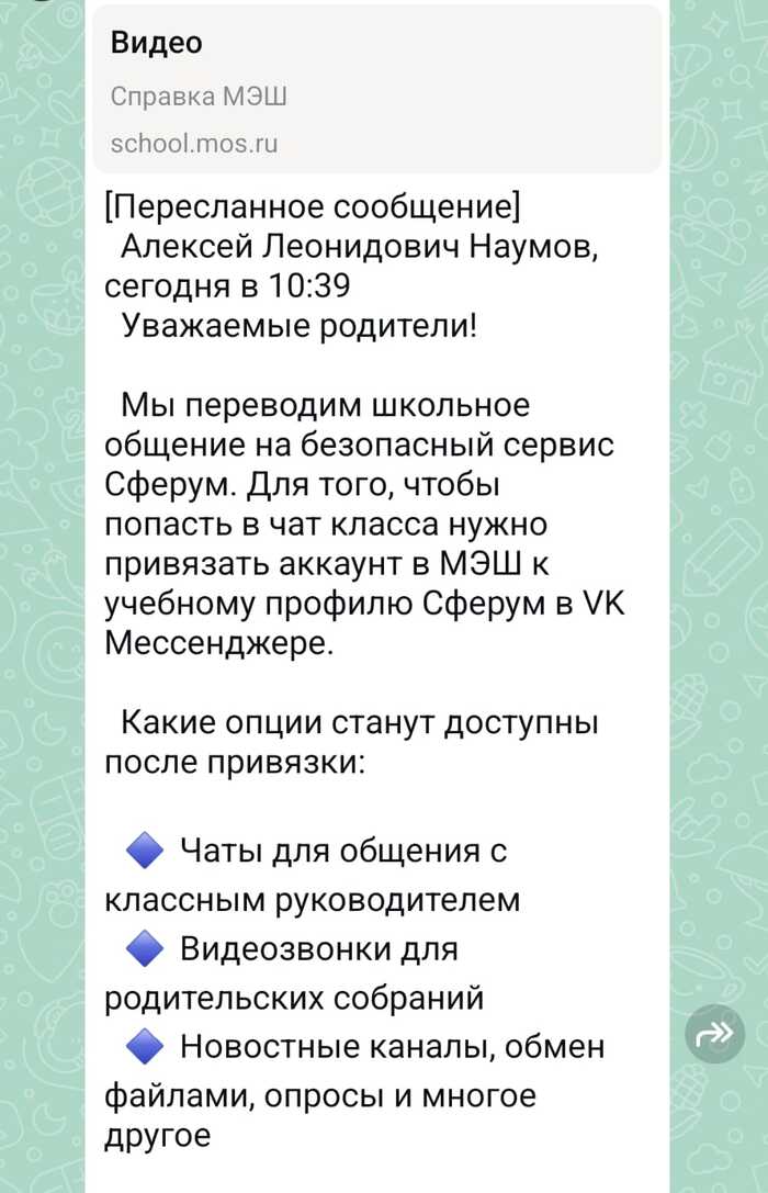 Когда родители начали возмущаться, почему собственно мы должны и зачем нам это надо? Получили ответ как всегда «приказ сверху». И что общаться с родителями по приказу директора педагогические работники нигде кроме Сферума не имеют права.