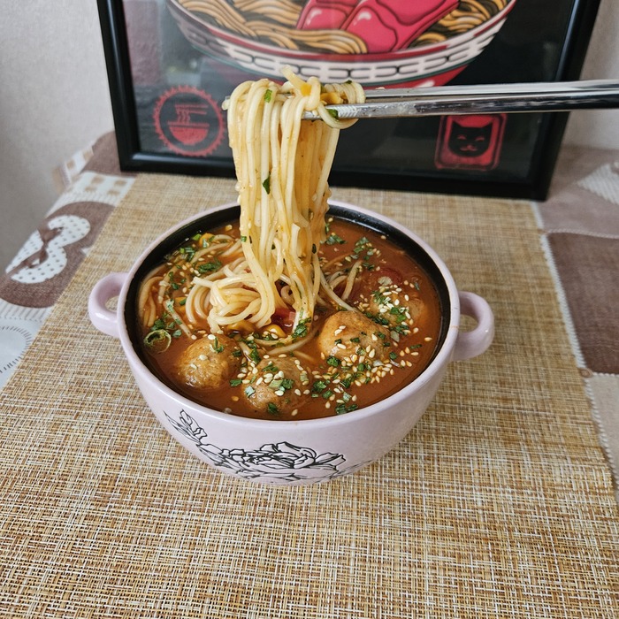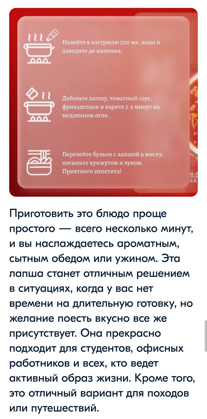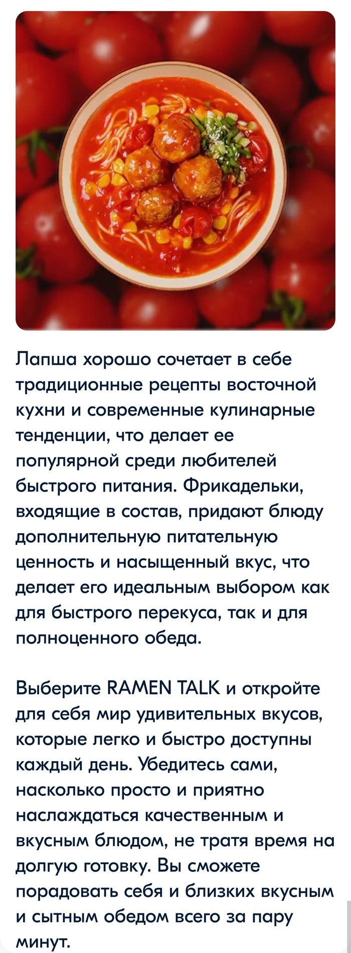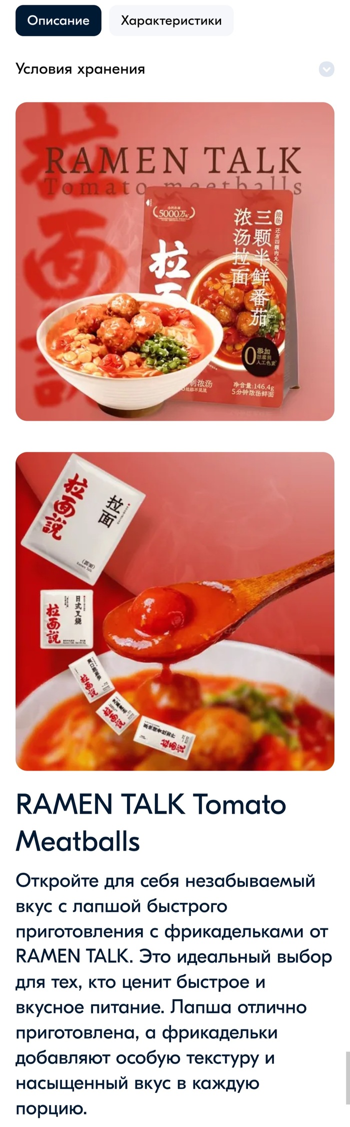 Скрины со страницы продавца и ссылка, для заинтересовавшихся. На настоящий момент нет в наличии, но можно посмотреть у других продавцов. https://www.ozon.ru/product/ramen-talk-tomato-meatballs-firm...