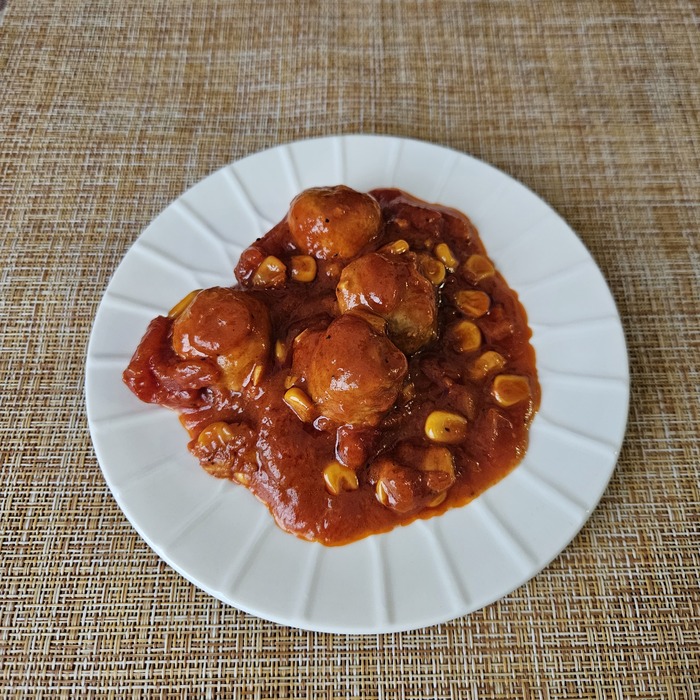 Самый большой и интересный пакет с мясными фрикадельками. В нём четыре фрикадельки в томатном соусе с кукурузой и кусочками томатов. Выглядит круто, пахнет здорово. Соус на вкус огонь! По количеству тоже неплохо.