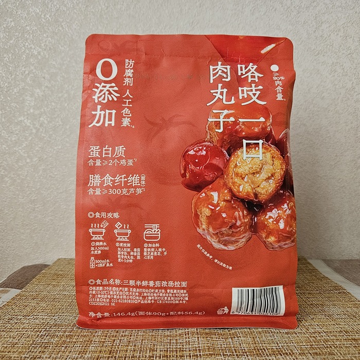 Всем привет! Пришло время очередного отчёта о работе моей лаборатории за прошедшую неделю. Спешу представить вам сегодняшнего героя – томатный рамен с мясными фрикадельками от китайского производителя Ramen Say (Jiangsu) Food Co. Ltd. Для ЛЛ: очень вкусно! Рекомендую. Куплена лапша была на Озоне. Цена на момент покупки составила вполне приемлемые 463₽. Доставка была длительная, т.к. ехала из Китая, но приехала замечательно упакованная и не повреждённая (учитесь, ВБ). Упаковка – достаточно большой пластиковый пакет в красных тонах с аппетитным изображением блюда на лицевой стороне. Русского текста на упаковке не наблюдается, но китайский неплохо бьётся переводчиком по фото. Лицевая сторона.
