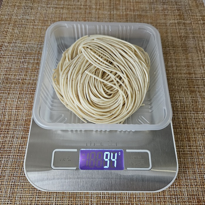 Пробежимся по содержимому. В первом пакете лапша в пластиковой чашечке. Лапша, кстати, интересная. Пшеничная, серо-белого цвета, но с коричневыми вкраплениями. Как я понял это отруби. Впервые встречаю такую. Масса лапши почти 95 граммов. По форме круглая и длинная. Скручена в аккуратный моточек.