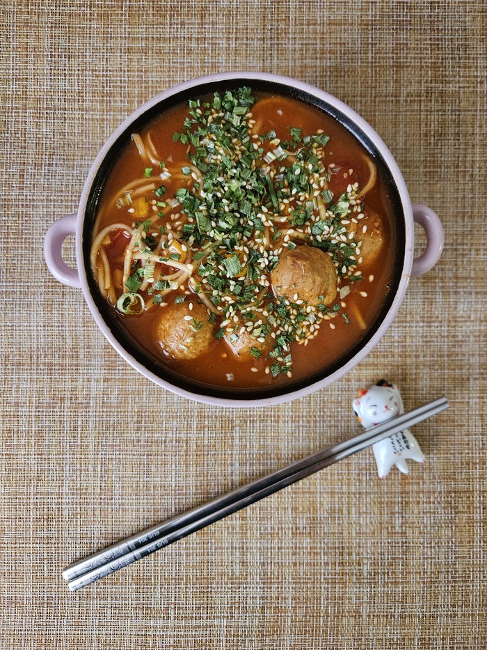 Готовим сие великолепие следующим образом. Кипятим 500 мл. воды. Туда закидываем соус, фрикадельки, лапшу и варим 5 минут. Затем перекладываем в дегустационную посуду и посыпаем зеленью и кунжутом. Кстати, после этой манипуляции аромат зелени раскрылся в полной мере.