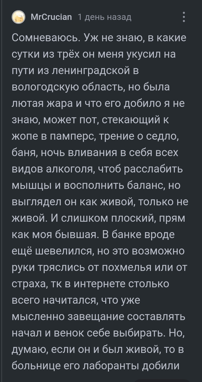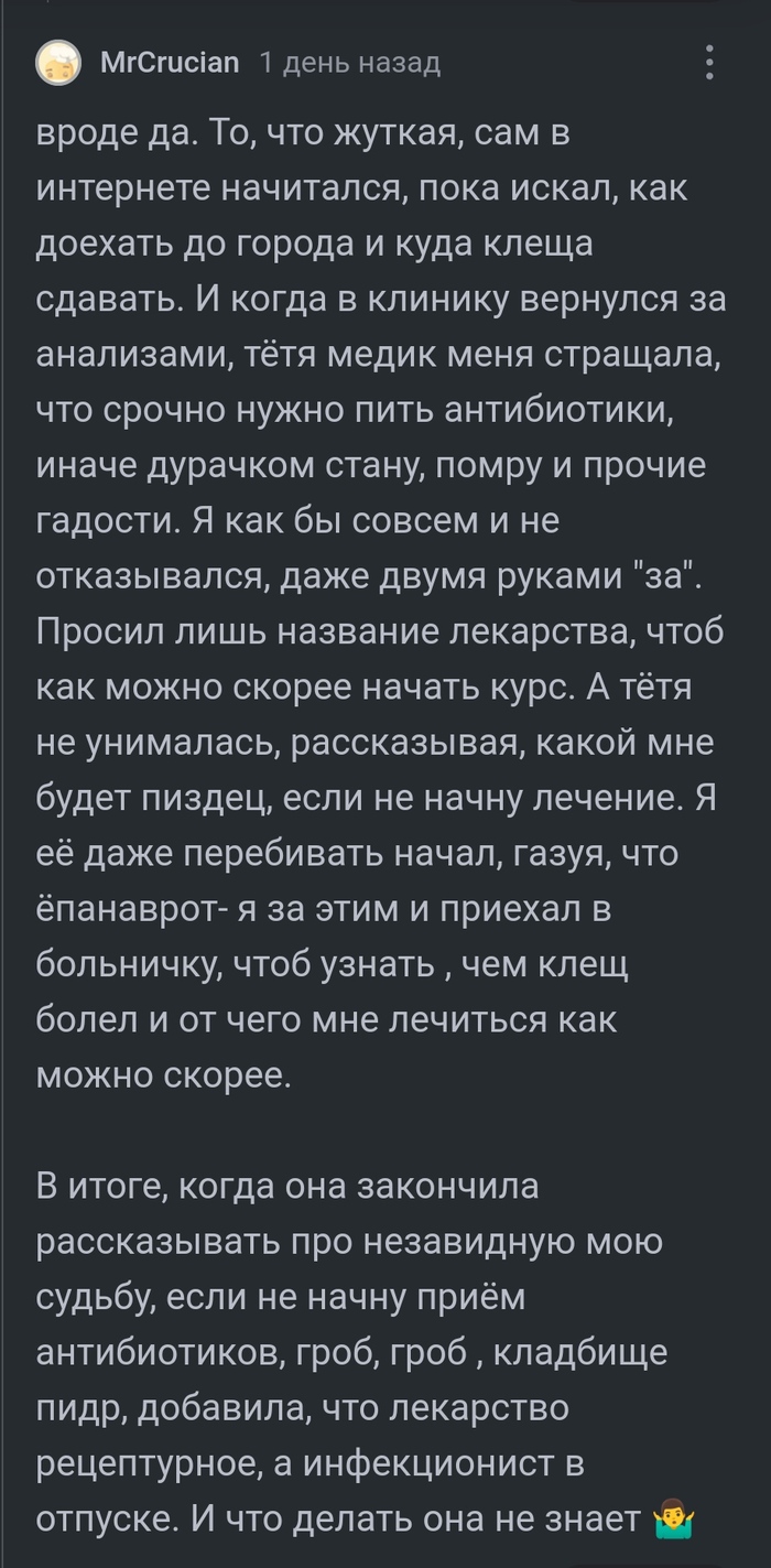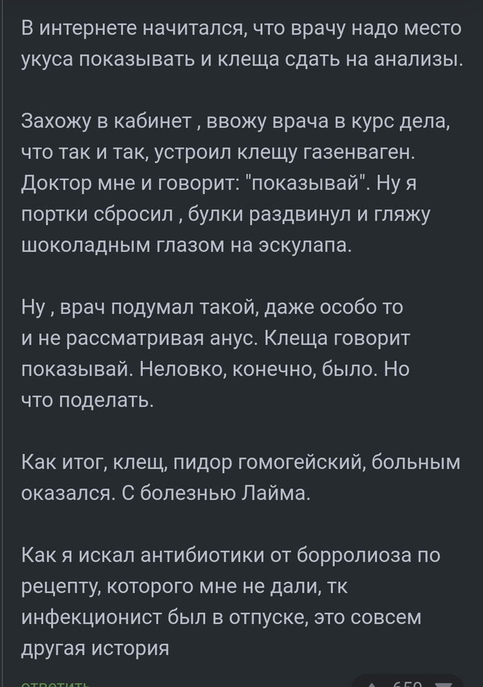 Следующие 20 минут мы занимались обоюдным стриптизом. Дошли и до трусов. Привлекли внимание нескольких старушек с участков поблизости. Итого, снято было 24 насекомых-клещей, 14 с меня и 10 с моей благоверной. Трое уже ползли по моей спине вверх, почти добрались до шеи. Я был, мать его, застегнут, запахнут, заправлен. Как???