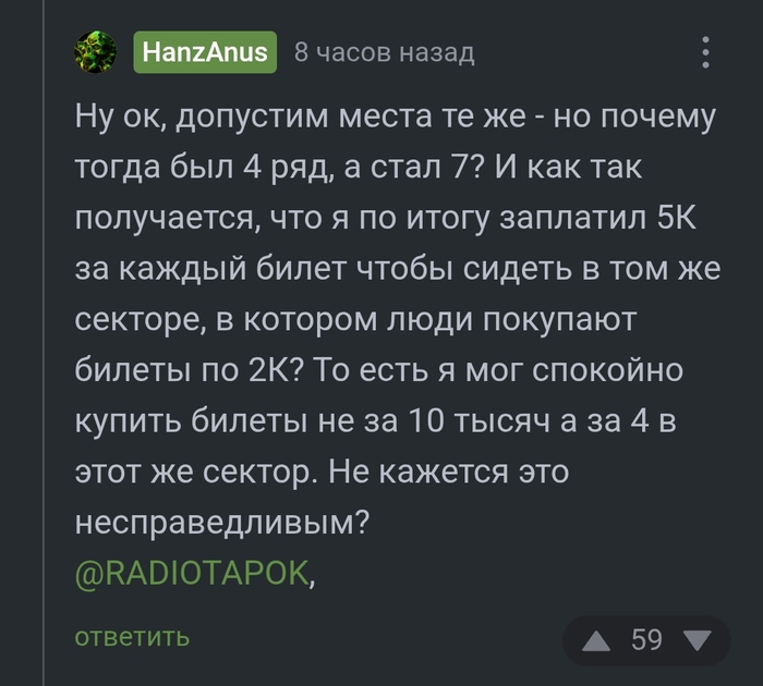 Ну и уже когда стал разбираться, оказалось, что это уже не первый такой случай именно с тапком, когда людей купивших билеты прокатывают - даже на Пикабу в прошлом году обсуждали. Неудачный концерт RadioTapok в РнД?