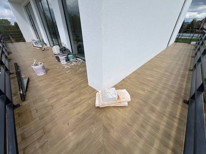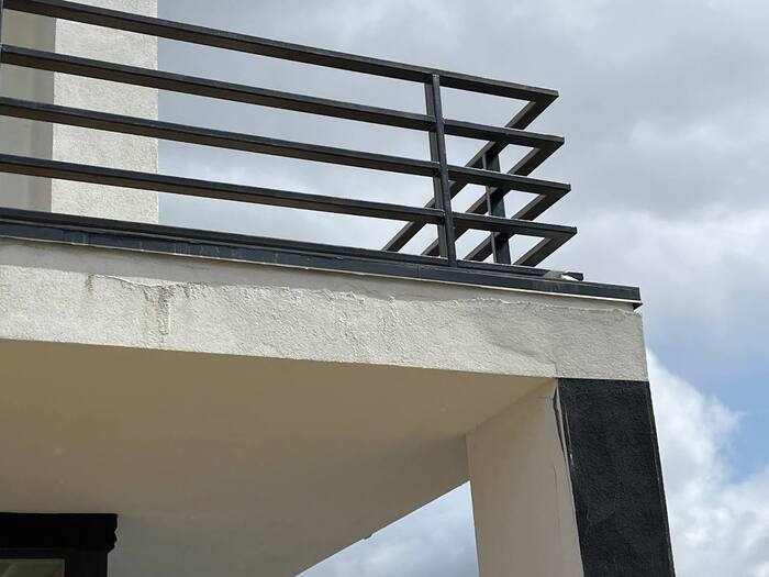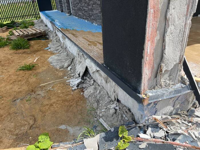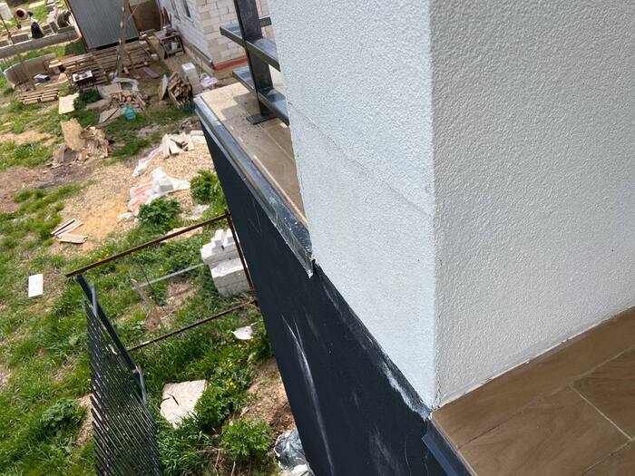 – Отсутствует организованный водосток с террасы. Вода стекает прямо по фасаду, что уже привело к его намоканию и повреждению.