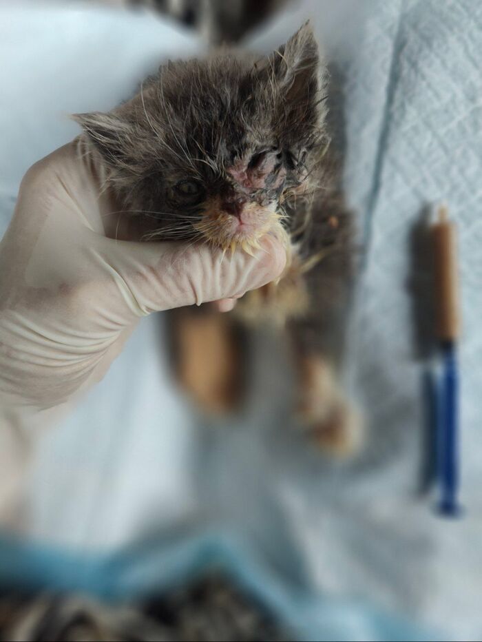 Я кошечку тоже подобрал у неё в место глаз две головы было и белый гной тек она бежала прижимая к маме я мимо ехал мать убежала а чудо неуспело я взяв в руки обратно не смог положить хотя мать с двумя котятами были в 5 метрах ,я схватил двух почистил им глаза все в гное и поехал в поликлинику один глаз спасли другой ампутировали ,сейчас ей 5 лет зовут ася в день пасхи её нашёл у меня 5ро всех спас.дай бог вам сил здоровья, малышке нужно окрепнуть и только потом через пару месяцев можно удалить глаз глистов прогнать сейчас усиленное частое питания тепло пить и ваша забота ежечасная.выкарабкается будем собирать на глаз деньги .
