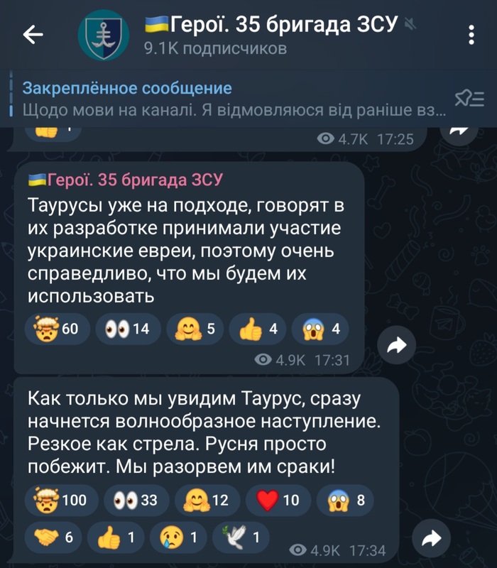 Автор ну нельзя быть таким доверчевым в интернете. Этот канал не имеет никакого отношения ни к 35 бригаде, ни к Украине в целом. Автор канала тролль который развлекается и ловит лулзы с таких как ты, по обе стороны конфликта. Учитесь фильтровать информацию.