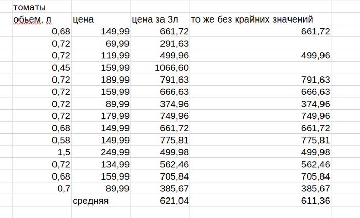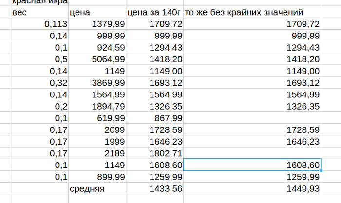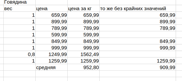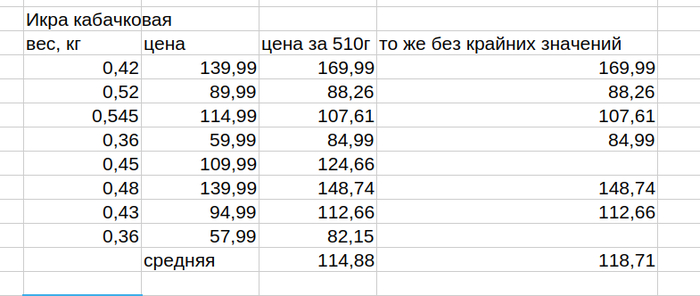 Посчитаем среднее на 1 кг общее и за вычетом крайних значений для контроля.