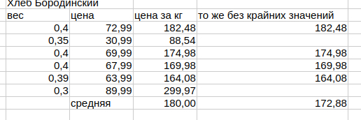А с чего такой выбор хлеба? Сделаем правильную выборку по ленте и возьмем среднюю цену хлеба. Помимо этого сделаем поправку на шринкфляцию. Советская обычная булка хлеба была весом в 1 кг. К нему и приведем цифры.