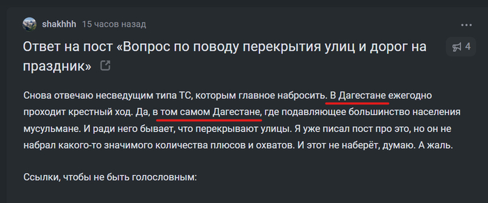 Снова отвечаю несведущим типа ТС, которым главное набросить. В Дагестане ежегодно проходит крестный ход. Да, в том самом Дагестане, где подавляющее большинство населения мусульмане. И ради него бывает, что перекрывают улицы. Я уже писал пост про это, но он не набрал какого-то значимого количества плюсов и охватов. И этот не наберёт, думаю. А жаль.