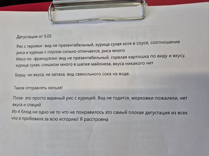 Что же, для меня это не было проблемой, так как я отработал в отделе RnD до этого больше года, и всегда первая дегустация это пробные моменты чтобы понять вкусовые предпочтения аудитории которая принимает решение. По результатам финансовый директор меня с директором вызвала "на ковер". Там я озвучил что для разработки блюд мне дают слишком сжатые сроки, на что я аргументировал что, для разработки есть сроки 3-5 дней на одно блюдо, либо до трёх блюд одного типажа (1-3 супа, 1-3 горячего из одних и тех же продуктов, например 3 блюда из курицы с разными гарнирами). На что мне сказали что, это бред и такого не бывает, ну что же мой опыт и мнение проигнорировали.