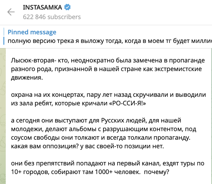 Но теперь она в России (сюрприз!), и вдруг её очень волнует "кто выступает для нашей молодежи", ловит иноагентов, пишет про Русских людей и "разрушающий контент", переживает что другие исполнители "разрушают нашу страну". И хочет чтобы у них не было возможности ездить в туры по стране. Такой, комиссар за чистоту сцены.