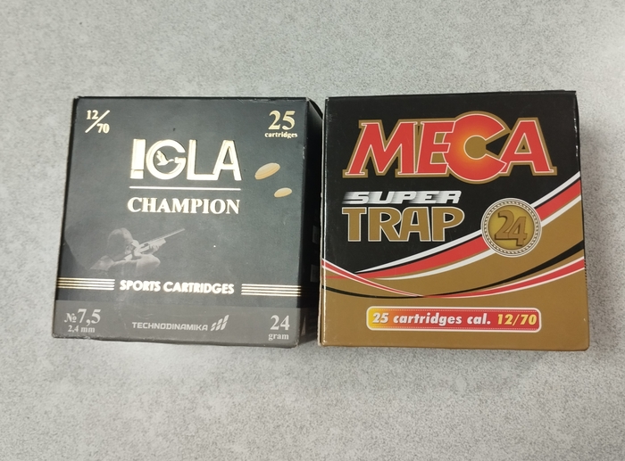 Как оказалось патроны бывают разных характеристик, не только калибр, но и длина гильзы, и вес заряда. Охотничьи патроны имеют вес дроби 32 грамма. Спортивные патроны в большинстве своём имеют вес 28 грамм. А тренер откопал в своих запасах спортивные патроны с массой заряда 24 грамма, а у них отдача чуток но поменьше.