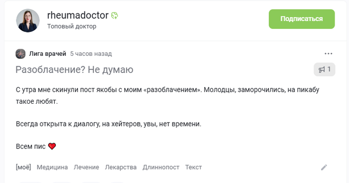Минутку, вы , автор, считаете, что информационные услуги сейчас не должны оплачиваться? То есть любая информация в любой сфере от людей, которые понимают что они дают в качестве информационной консультации, не должна иметь монетизацию? Минус риэлторы, минус салоны по продажам авто, минус 99% юристов, те вообще никогда не гарантируют ничего, минус кучу других профессий , которые предоставляют информационно консультационные услуги. Мне нужно было найти как начать оформление на позднее переселение в Германию, я воспользовалась такими услугами. Заплатила, получила пакет рекомендаций и немного конкретных контактов, а так же пошаговые инструкции. Сама я замаялась бы все это искать, а тут все рассказали, показали и тд. Тоже по сути торговля воздухом по мнению автора. Точно так же и с мед блогингом, вы реально настолько тупые, что не способны понять, что любая консультация в удаленном формате в медицине, проведи ее хоть медсестра, хоть практикующий профессор, не будет являться ничем более , кроме как информационной консультацией. Даже если вы предоставите сегодняшние результаты анализов, любой адекватный специалист запросит вас сдать все снова. когда вы придете к нему на прием лично. Я эти медблоги не читаю регулярно, смотрю буквально два канала на Ютуб. Но то что я смотрела от РЕАЛЬНОГО хирурга, и там он всегда описывает и случаи из практики и свои выводы , для всей аудитории канала. Как я тут после всего этого срача прочитала несколько постов мед блога , то же самое написано. Думаю в личной онлайн консультации даются такие же рекомендации, без конкретики, так как сказать что то конкретное на расстоянии не реально. И где посты от пострадавших? Не видела ни одного , кроме постов от тех, кто реально озабочен только получением этими медблогершами донатов. Все это похоже на организованную травлю таких каналов. Частным клиникам не хватает денег за консультации? Может надо начинать лечить людей , а не зарабатывать на их болезнях?