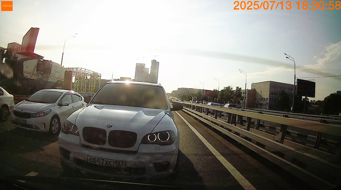 Я, komm18, 13.07.2025 примерно в 18:30 ехал со своей беременной женой, на своем автомобиле по Волоколамскому шоссе города Москвы, в районе дома 83 в направлении центра города. Я ехал в крайней левой полосе со скоростью движения потока, монотонно, без ускорений, торможений и без перестроений, соблюдая безопасную дистанцию от впереди идущего автомобиля. По неизвестной мне причине водитель белого автомобиля BMW X5 гос номер С647ХС197, который ехал в попутном направлении, произвел опасное сближение сзади с моим автомобилем и начал интенсивно сигналить и моргать дальним светом продолжительное время. В связи с этим, я принял решение плавно остановиться, включив аварийные огни, чтобы узнать что случилось. Но после этого водитель бмв совершил резкий маневр в соседнюю полосу и проехал немного вперед. Далее он начал ехать медленнее скорости потока, дождавшись когда я начну с ним ровняться в своей полосе, он резко перестроился в мою полосу и совершил экстренное торможение передо мной без явных на то причин, что могло повлечь за собой серьезное ДТП. Прилагаю видео со своих видеорегистраторов.