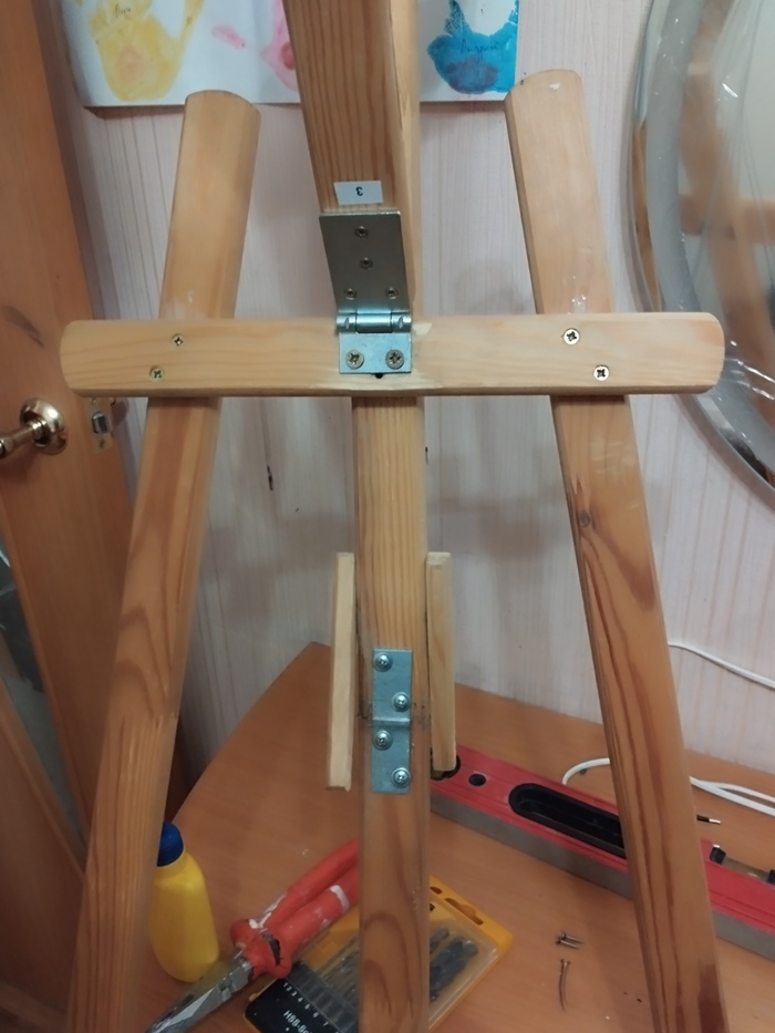 Видно что мольбертом интенсивно пользовались, все шарниры и соединения были разболтаны.