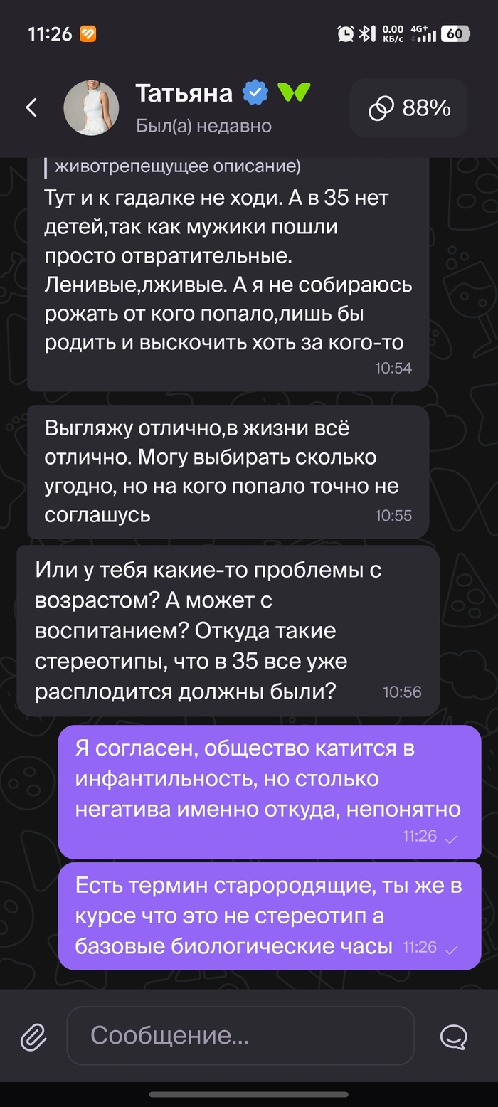 И вот я ставлю лайк, а у Татьяны премиум и я за полдня получаю лайк в ответ, первым делом конечно же спрашиваю, а что не так, ну и смотрите дальше. Считаю что после вот таких барышень рассуждать что мужчины не хотят РСП ну как-то даже обосновано может быть.
