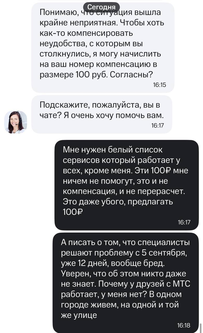 И тут забава: вся моя семья и друзья сидят на МТС, я тоже. Но у меня одного этот белый список не работает. Прождав два дня и убедившись, что ситуация не меняется, пишу в поддержку. Спойлер: ничего не решилось.