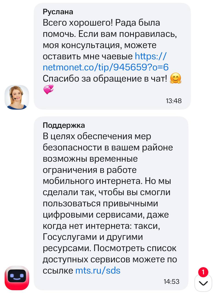 *И напоследок*: Не знаю, норма ли это, но оператор в конце общения кидает ссылку «оставьте чаевые». Я охуел. Руслана подрабатывает в ресторане? МТС своим операторам не платит? Есть предчувствие, что руководству и самим операторам МТС тупо похуй на то, что они делают.