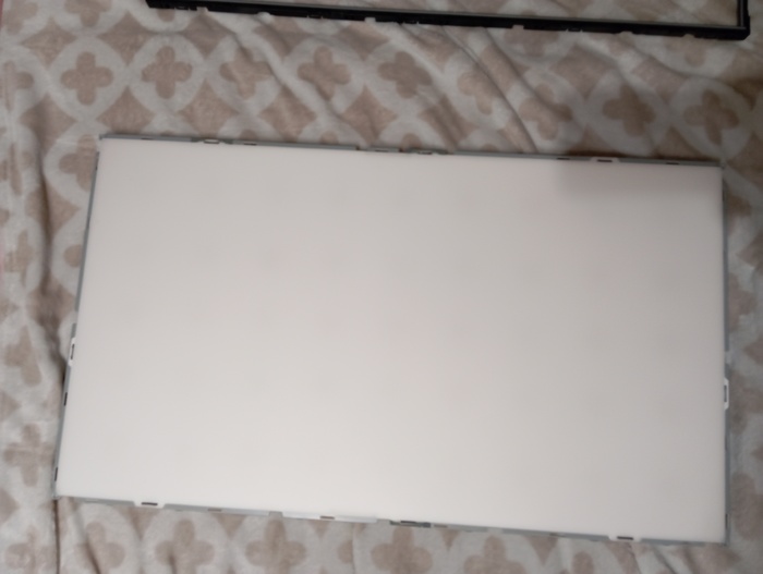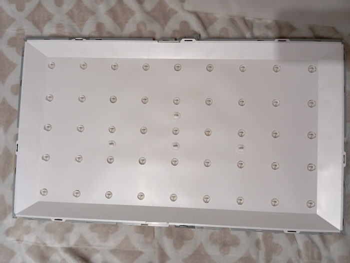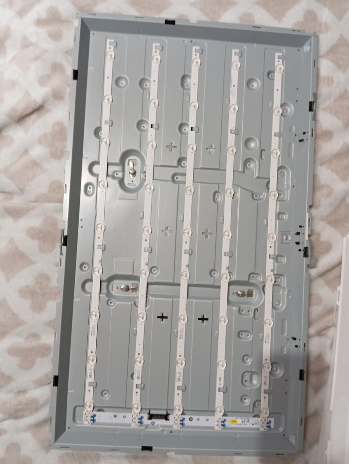 В один вечер при просмотре футбола на ТВ потух экран, а звук остался. Денег на новый телек особо нет, пришлось почесать репу и лезть на ныне заблокированный сайт. Самая распространённая проблема - не работает подсветка. Понять это можно, если посветить фонариком на экран, и там видно изображение. У меня оказалось тоже самое. На обратной стороне телека посмотрел шильдик телевизора и с синего сайта заказал комплект подсветки для ТВ (5 светодиодных лент). После получения приступил к разборке.