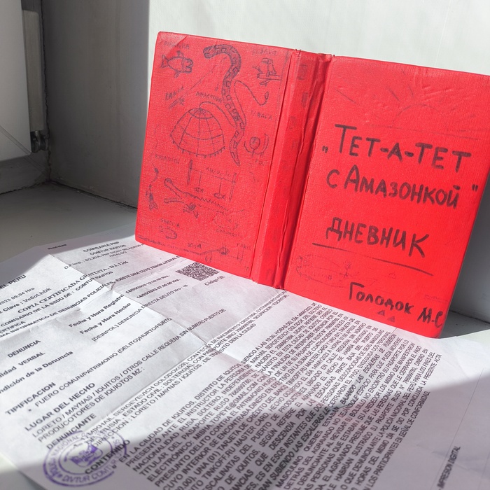Оттуда же и амазонский дневник. Я вёл его на протяжении всего пути, и он стал основой для будущей книги («Тет-а-тет с Амазонкой»). Порой я дорожил им даже больше, чем жизнью. Под ним — документ из полиции Икитоса, где я давал показания об ограблении (забрали паспорт).