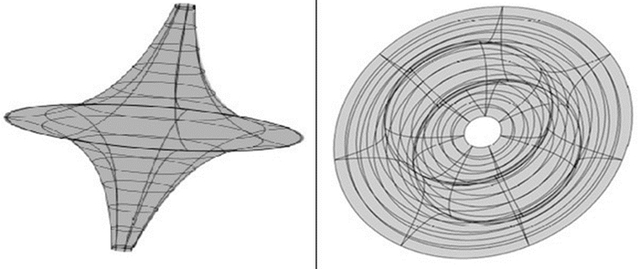 Визуально они выглядят как две перевёрнутые воронки, соединённые основаниями, или имеющие небольшой зазор. Кривизна стенок у них переменная отрицательная.