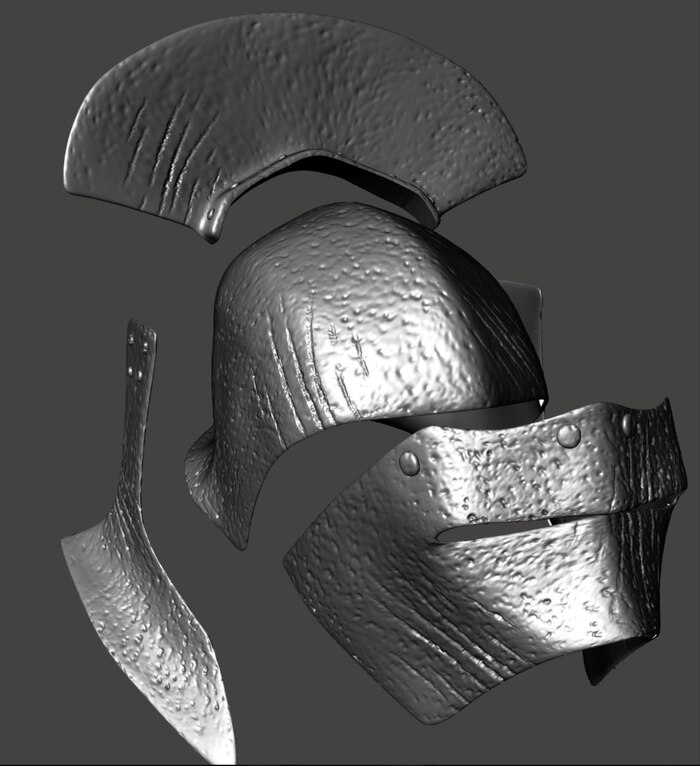добавляются элементы повреждений доспеха - борозды "ачивка покорми варга", зарубки и пр.