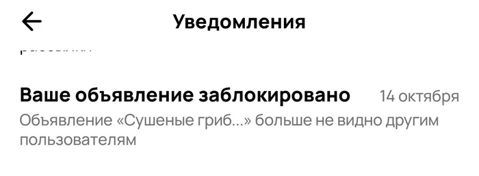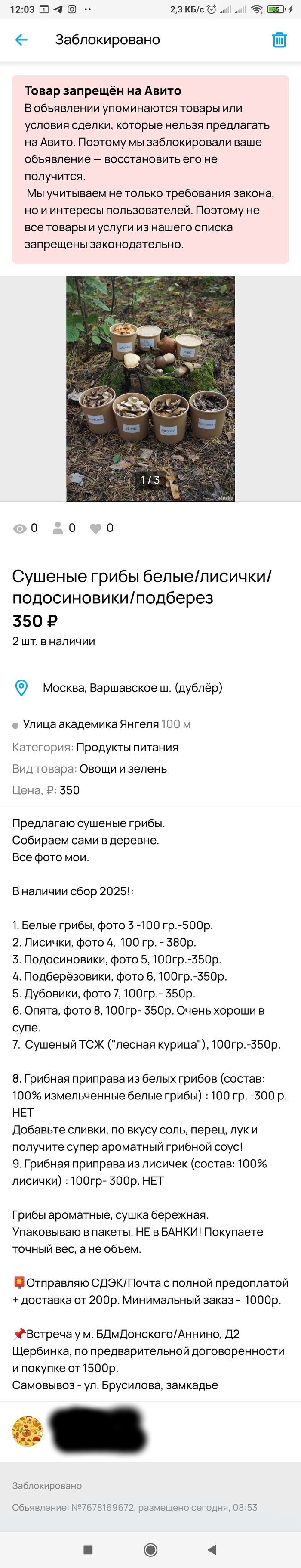 первый пост: Авито без объяснения причин блокирует объявления, в которых нет ничего запрещенного (сушенные съедобные обычные грибы, излишки которых в небольших количествах мы продаем после сбора, который очень любим). При том, что одно (исходное) объявление было создано еще в 2018 году и прекрасно работало ранее.