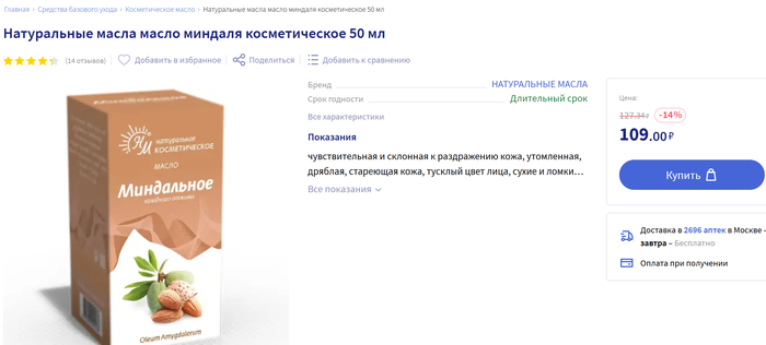 6) Миндальное масло. Бля, ну тут не надо объяснять же? Пустим бюджет по пизде, купим самое дорогое, в аптеке, в розницу. 109р * 3% = 3.27 р.