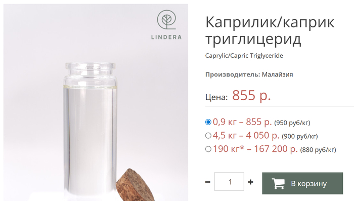 4. Каприлик. Пальмовое/кокосовое масло, его производное. Смысл тот же. Просто жыр. 950р/20=47.5 р за 50гр. *10% в составе = 4.75р.