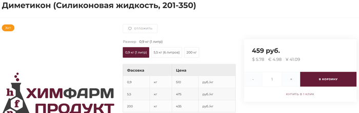 Б) Диметикон. Это как раз и есть синтетический силикон, которым так гордится производитель. Цена такая же на том ж сайте (280), но буду брать данные с разных сайтов, чтобы не обвинили в предвзятости. Поэтому возьмем силикон подороже. Хуй с ним, пусть будет 500р/кг. т.е. 25р за 50 мл. В составе его 25%, т.е. 6,25р.