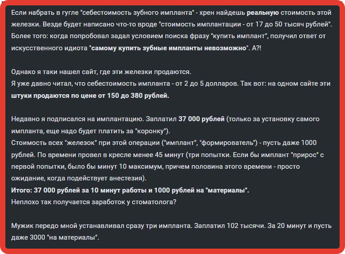 Мужик передо мной устанавливал сразу три импланта. Заплатил 102 тысячи. За 20 минут и пусть даже 3000 "на материалы".